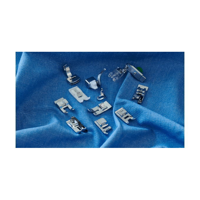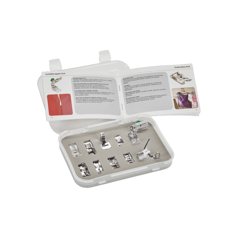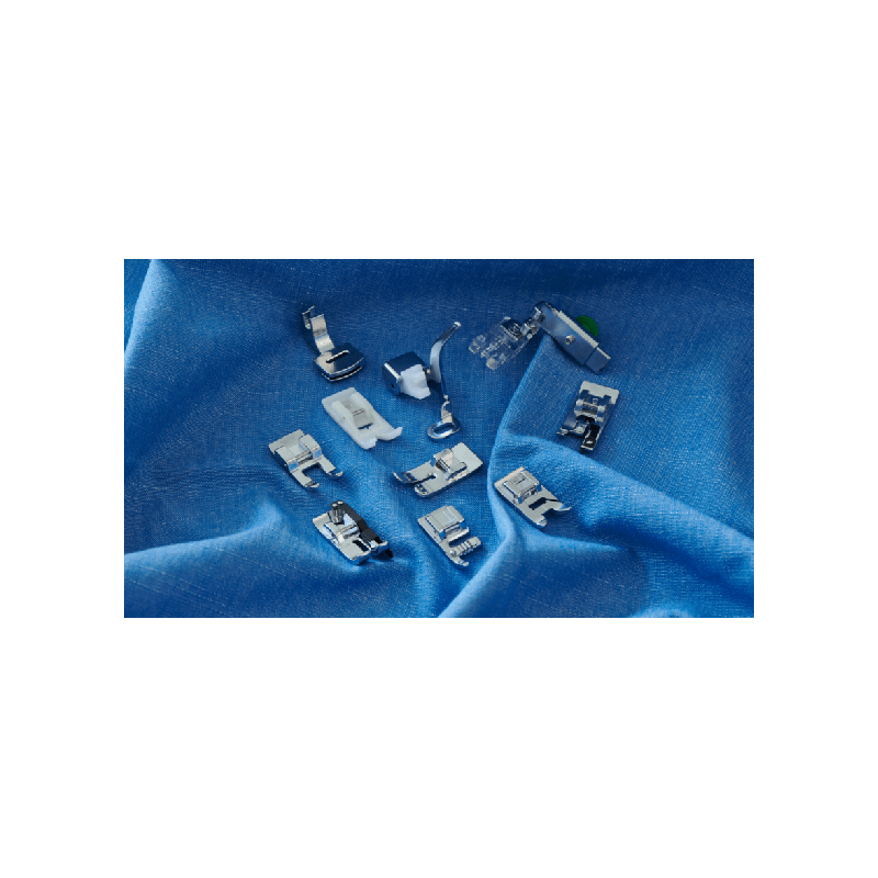 Ce kit réunit plusieurs pieds-de-biche essentiels pour faciliter vos réalisations au quotidien. Il vous aidera aussi bien à travailler des matières épaisses, comme le denim, qu’à obtenir des finitions nettes et régulières grâce à des ourlets soignés. Chaque pied a été développé pour répondre à un usage spécifique, afin de garantir un rendu propre et professionnel, quel que soit le projet.