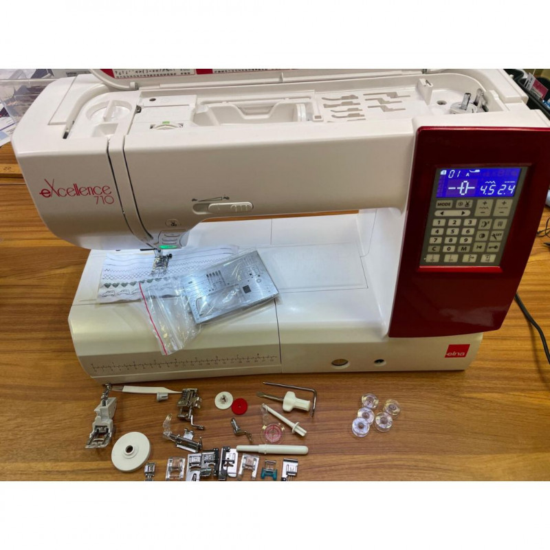 En stockAvec l’elna eXcellence 710, vous bénéficiez d’une importante surface de couture, d’une multitude de fonctions utiles et de caractéristiques impressionnantes: x 170 points en 9 mm de largeur, y c. alphabet et 10 boutonnières automatiques x coupe-fil automatique et point d’arrêt x panneau de commande tactile pour la sélection des points et des réglages x vitesse de couture max. 1000 points/min. x convertisseur de plaque à aiguille en un clic