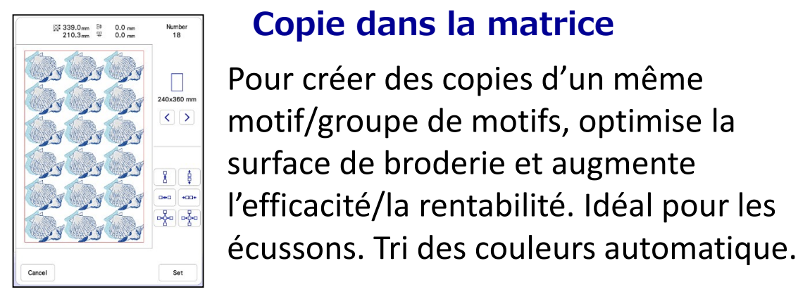 Fonction d'édition du motif - taille, rotation, miroir, ... | Oui |
