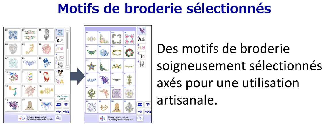 523 motifs de broderie intégrés, du classique au contemporain